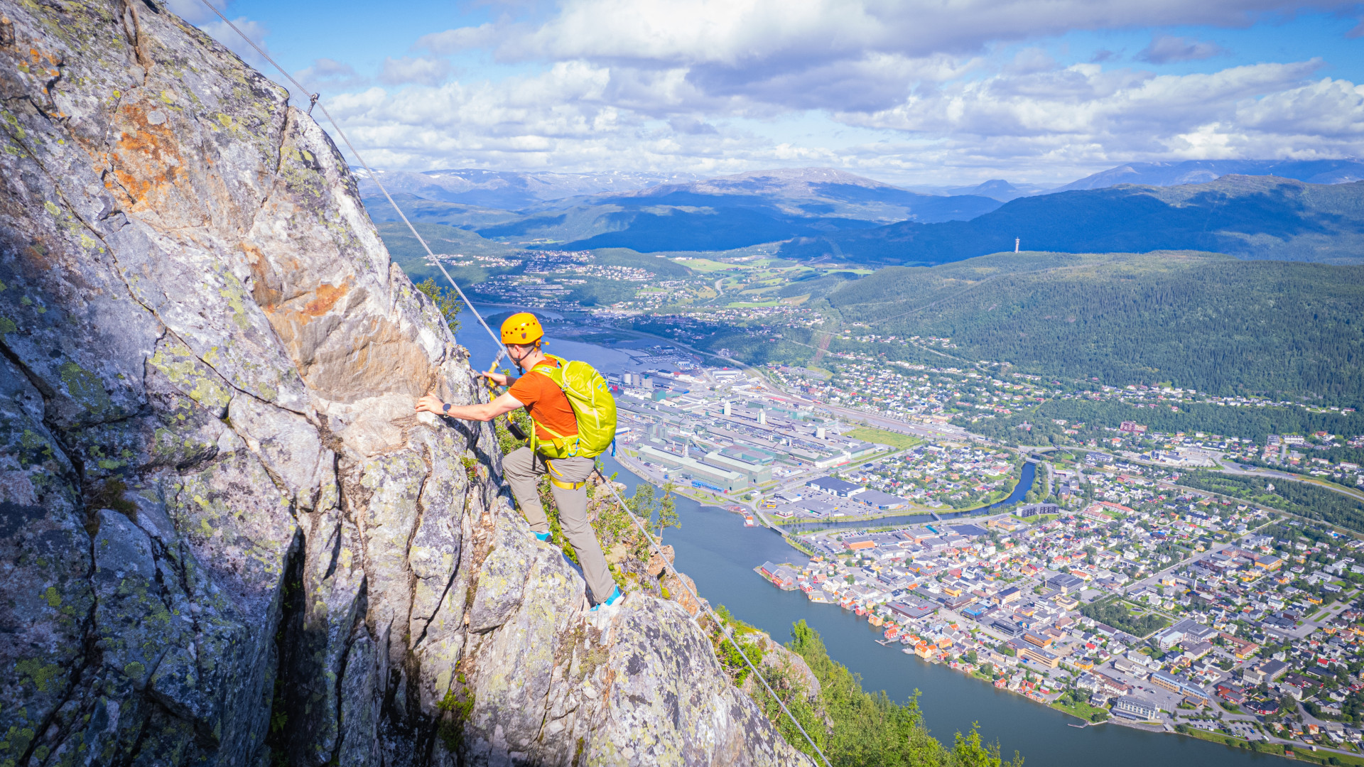 Bli med på en guidet via ferrata-klatring opp Øyfjellet, med fastmonterte wirer og naturlige trinn i fjellet. Nyt en pause med storslått utsikt over fjorden og fjellene rundt Mosjøen.